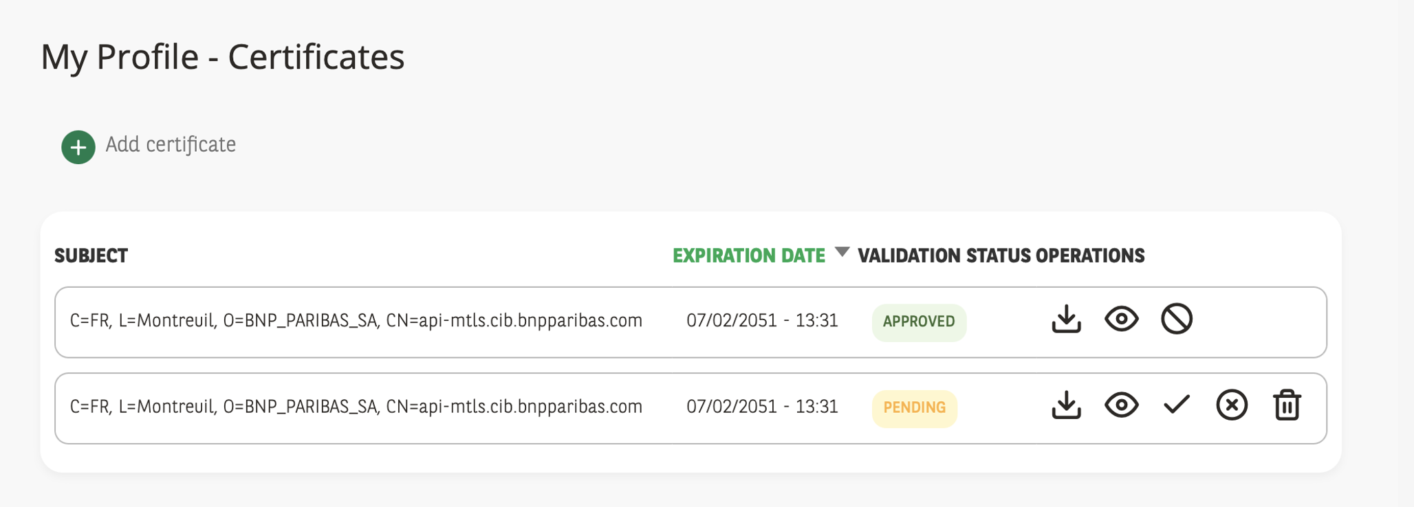 Le certificat nouvellement déposé à un statut « PENDING » en attendant sa validation ou sa révocation par les Gestionnaires de certificats